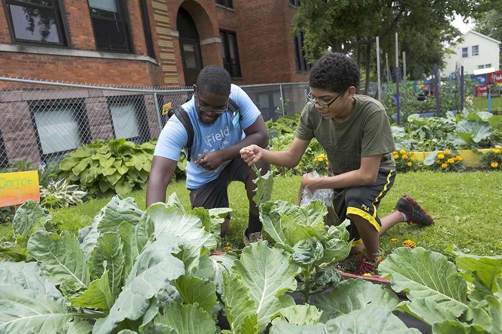 RIT student Jovon McCullough, left, shows 13-year-old Eisaiah Montanez and other children from St. Phillip Missionary Baptist Churchâs Academic Summer Camp program the Childrenâs Garden on First Street in Rochester. McCullough, a third-year public policy major from Rochester, is a student leader in the Field to Table program, part of RITâs University/Community Partnership with the Marketview Heights Collaborative Action Project. -