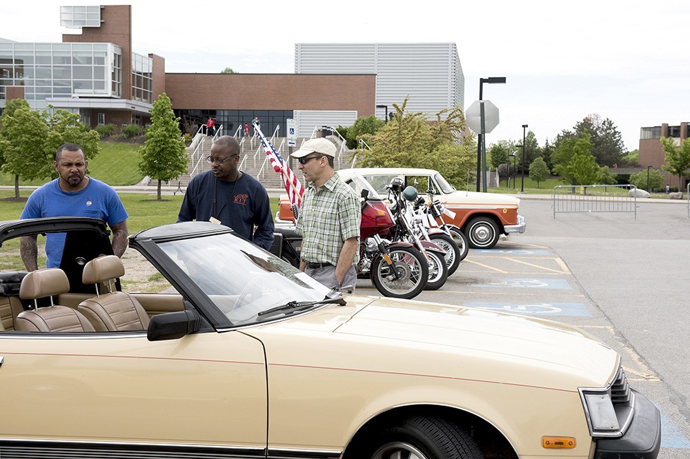 RIT Staff Council hosted its yearly Bob Howie Memorial Classic Car Display May 27 as part of the annual Staff Appreciation Day and Community Picnic. From left, Alberto Jeres and Richard Gray talk with Josh Goldowitz about his 1981 Toyota Celica Sunchaser.