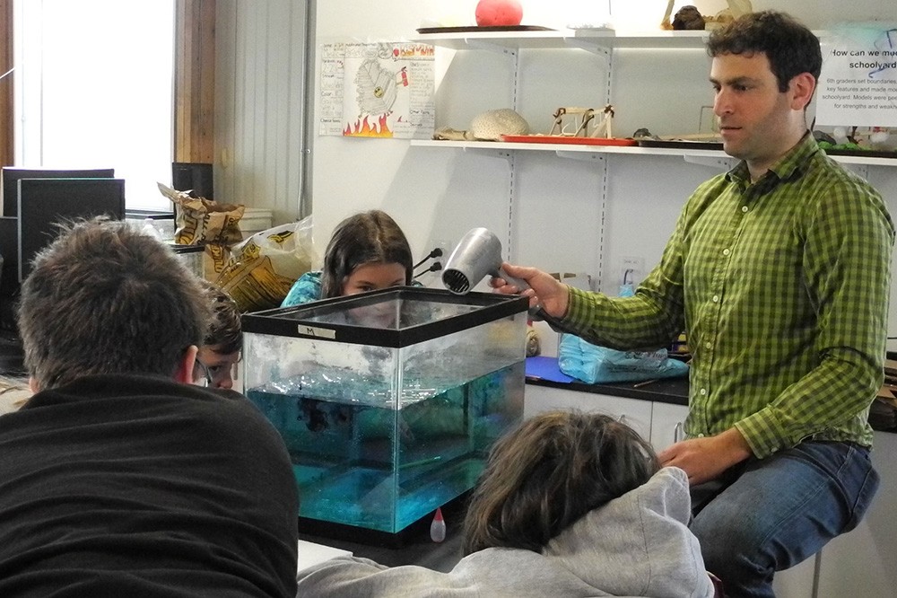 RIT researcher Matt Hoffman talked to fifth graders at the Harley School on May 30 about plastic pollution in the Great Lakes. Using a hair dryer, Hoffman, seated above, simulated wind and currents in a small aquarium and added drops of blue food coloring to show water layers mixing beneath the surface. Hoffman, an associate professor in RIT's School of Mathematical Sciences, estimates nearly 22 million pounds of plastic wind up in the Great Lakes system every year.