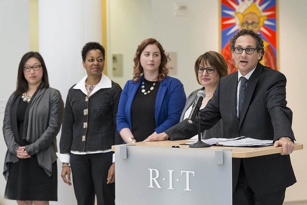 Scott Franklin, right, co-director of the Inclusive Excellence program at RIT and director of the Center for Advancing STEM Teaching, Learning and Evaluation, and his team won a Howard Hughes Medical Institute’s Inclusive Excellence Initiative grant to increase diversity and inclusivity among RIT undergraduate science majors. Pictured with Franklin at the June 7 campus announcement are, left to right, Lea Michel, associate professor of chemistry and chair of Women in Science; Tina Chapman DaCosta, Diversity Theatre Program Developer; Jennifer Connelly, visiting assistant professor; and Dina Newman, associate professor of life sciences and co-director of the initiative. The grant will enable RIT to increase infrastructure, resources and expertise to involve and retain deaf/hard-of-hearing, female and African-American, Latino/a-American and Native American students and develop strategies for supporting their success.