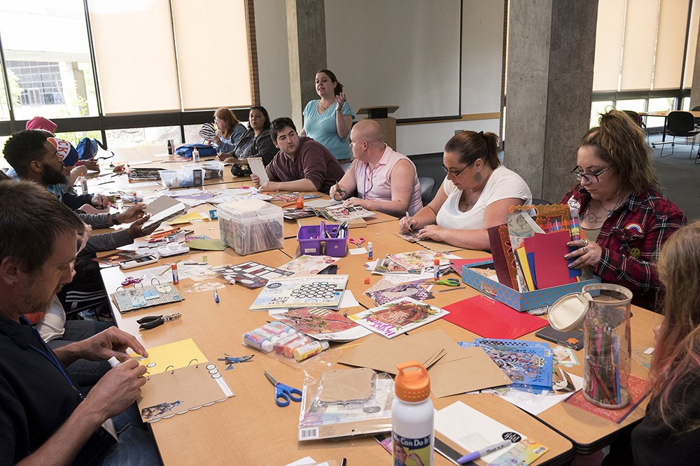 The annual East House Enrichment program is taking place at RIT June 5-8 and June 12-15. The program is designed to broaden other treatment and rehabilitation services and to encourage participants who are recovering from mental illness or substance abuse disorders to pursue educational goals to achieve independence and self-sufficiency. Classes include wellness, Chinese, public speaking, creative writing and more. Here, a Creative Journaling class made a journal to write in later.