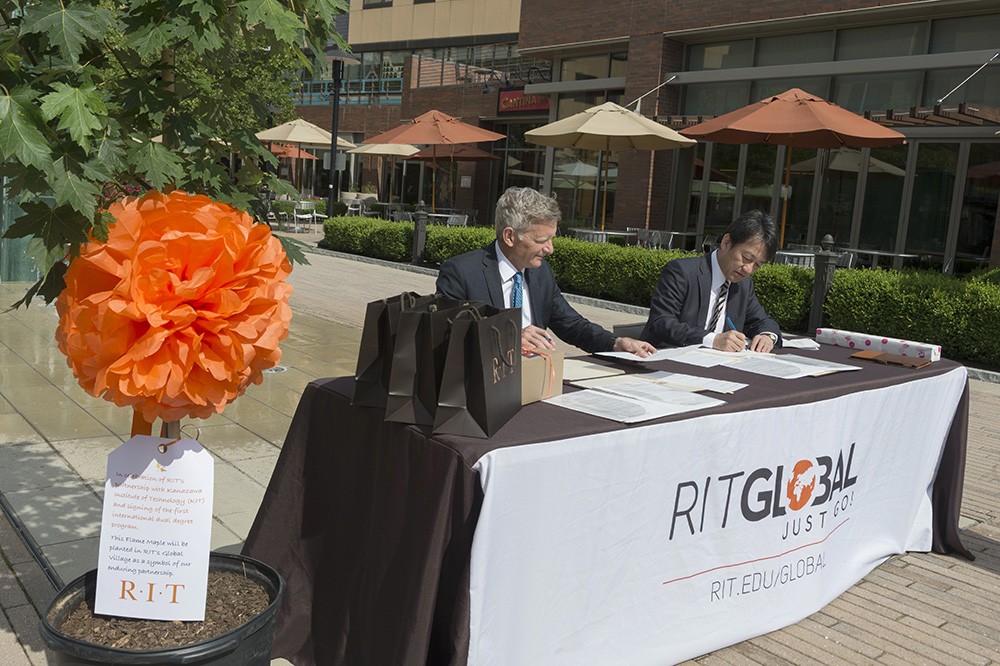 A signing ceremony for RIT’s first international dual degree agreement between Japan’s Kanazawa Institute of Technology and RIT’s Kate Gleason College of Engineering took place June 9. From left, Jeremy Haefner, RIT’s provost and senior vice president of academic affairs, and President Satoshi Osawa, Kanazawa Institute of Technology, signed the documents.