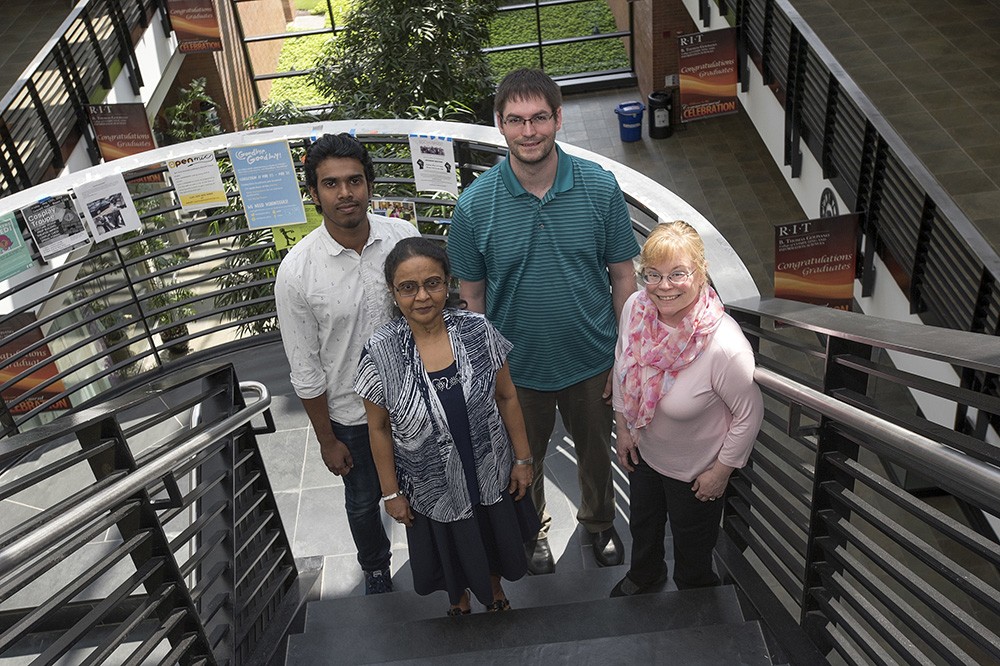 Researchers from RIT developed a high-speed internet highway for emergency first responders and managers. The new network protocol, called Multi Node Label Routing (MNLR) protocol, allows digital information to travel faster and more reliably during emergency situations. The team includes (from left), Joe Tom Job, a computer science graduate student, Nirmala Shenoy, professor in the Department of Information Sciences and Technologies, Erik Golen, visiting assistant professor in the Department of Information Sciences and Technologies, and Jennifer Schneider, the Eugene H. Fram Chair in Applied Critical Thinking at RIT.