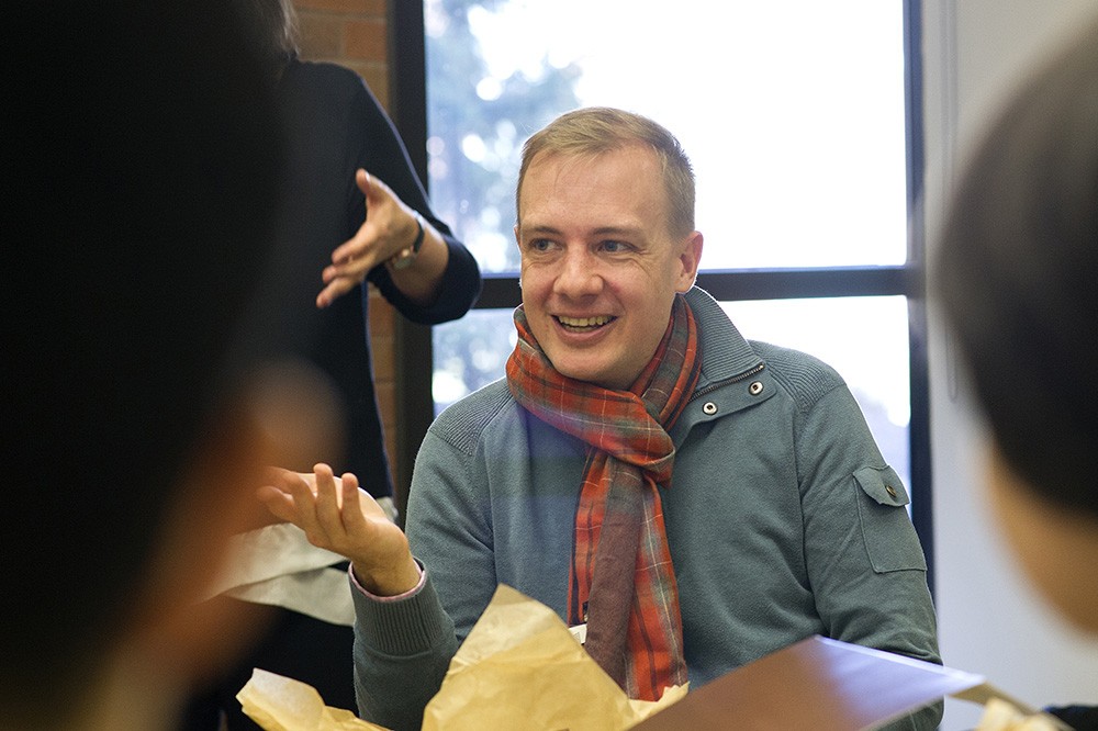Hal Daume III, associate professor in Computer Science at the University of Maryland, meets with computing and information sciences Ph.D. students and faculty facilitators prior to his talk during the Distinguished Computational Linguistics Lecture, where he will talk about natural language processing on creative content. -