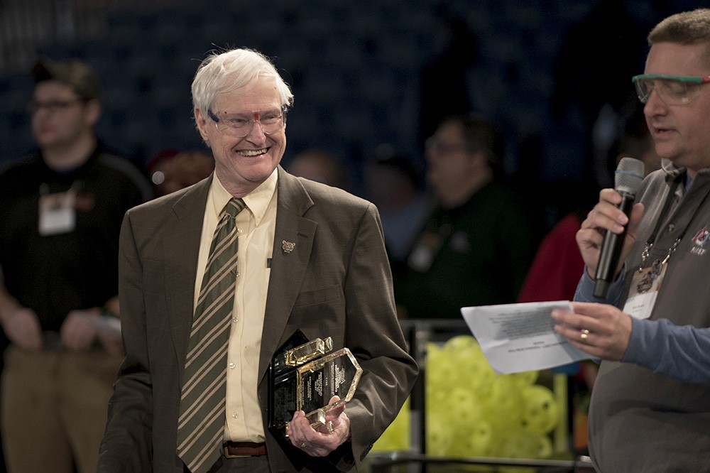 RIT President Bill Destler was recognized for his long-time support of FIRST Robotics and the annual Finger Lakes Regional competition on March 17. Destler, left, was honored by Rick Byrant, a member of the Finger Lakes Regional Planning Committee. -