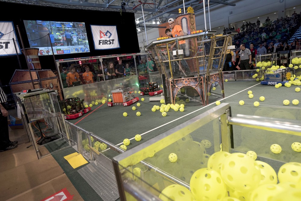 FIRST Robotics and the annual Finger Lakes Regional competition welcomed high school teams from across the Northeast and Canada to RIT, marking its 13th year here. This year, robotic adventure clubs mobilized for Steamworks. Forty-nine high schools competed at the event that featured team alliances acting as adventure clubs from an era in which technology relied on steam power to prepare airships for the ultimate long distance race. -