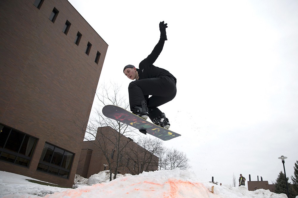 Ryan Jeter, a second-year 3D design student from Rochester, catches some air on the hill next to The Wallace Center. Temperatures are expected to reach only into the mid-20s today but may reach the 50s on Friday. -