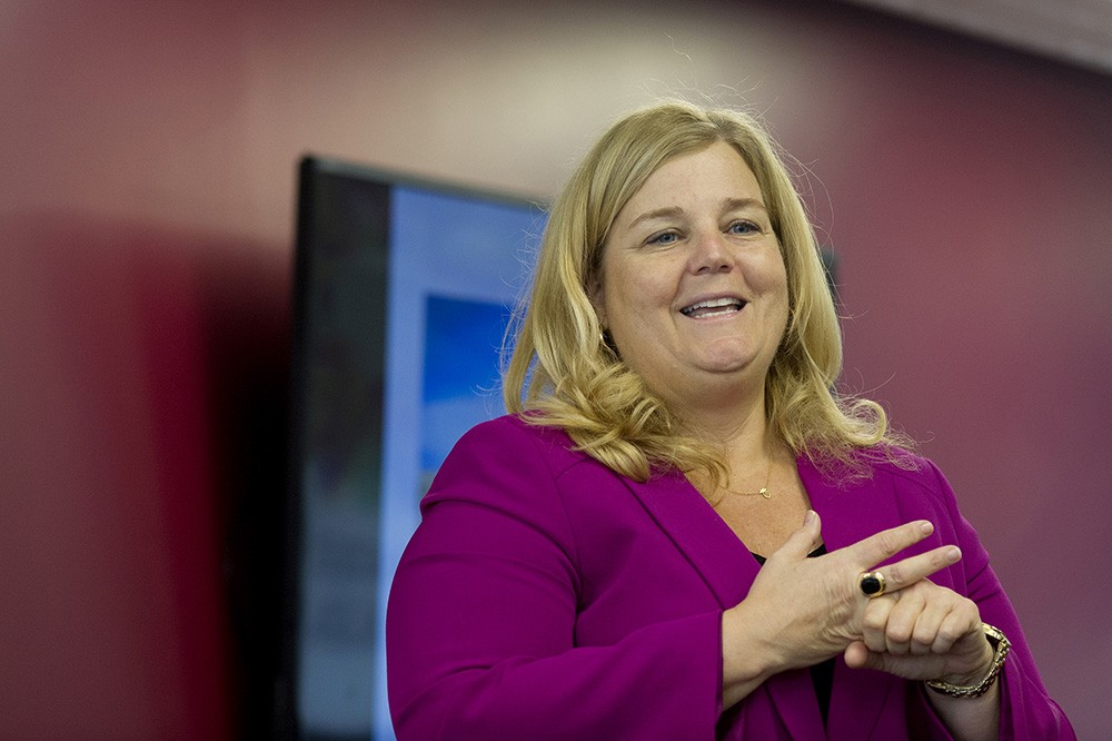 Jeanne Casares, associate vice president and chief information officer, spoke as part of the Iâm First speaker series March 22. The Iâm First program at RIT was started two years ago to provide support to first-generation college students. The program has a monthly lecture series that allows first-generation faculty and staff the opportunity to share their stories of success. -