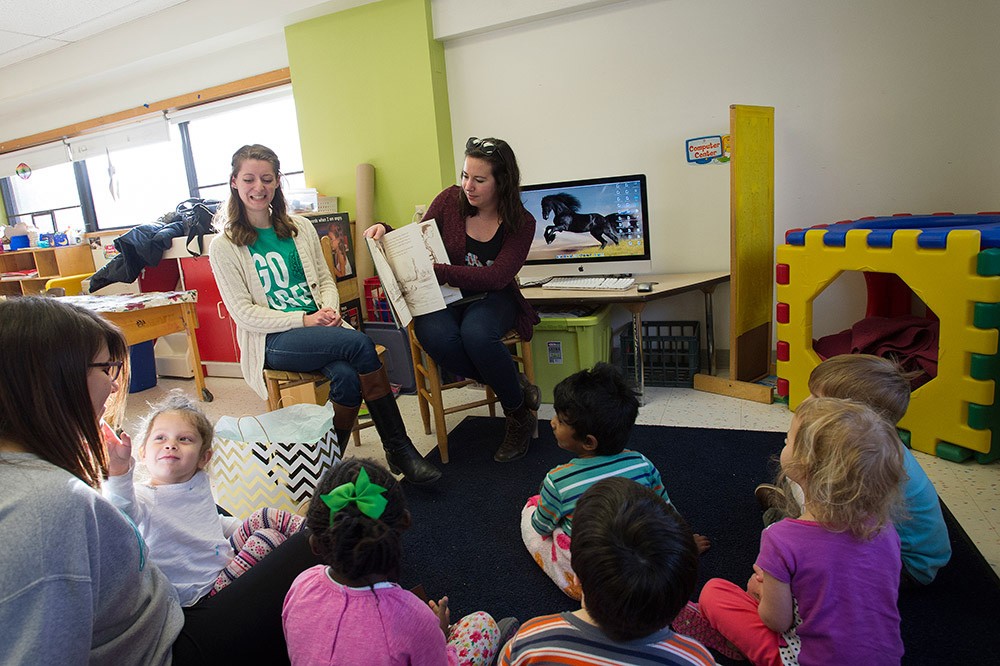 Seated from left, Bridgit Hrubecky, a second-year biomedical science student from Albany, N.Y.; Carley Geruntino, a third-year diagnostic medical sonography student from Utica, N.Y.; and Leigh Bechet, a fourth-year industrial engineering student from St. Charles, Ill., read to a group of 3-year-olds at Margaretâs House, RITâs child care center. A new program with the RIT College Panhellenic Council donated 20 books to the center in recognition of 10 students in sororities, including these three, who earned 4.0 averages in the fall semester. -