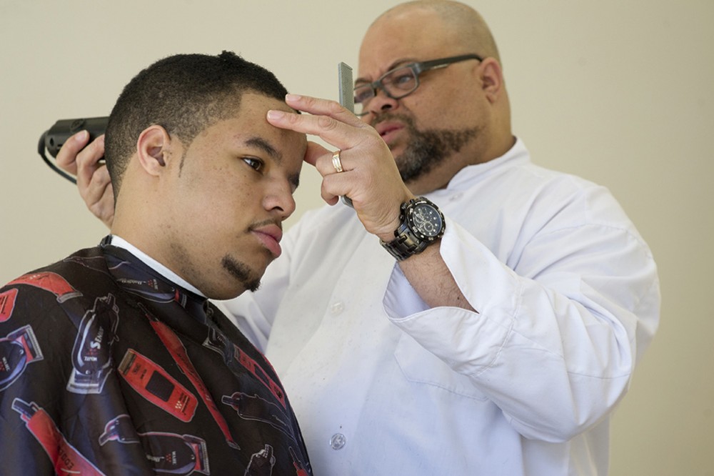 Miles Hood, a first-year hospitality and tourism student from Rochester, N.Y., received a brush cut from his father, William Hood Sr. of Epik Hair Studios during the GLBT Health Fair March 23. The Student Wellness event featured information from Trillium Health, Victory Alliance, Gay Alliance, Student Wellness and other organizations. Representatives offered information about health, samples, games and free haircuts. -