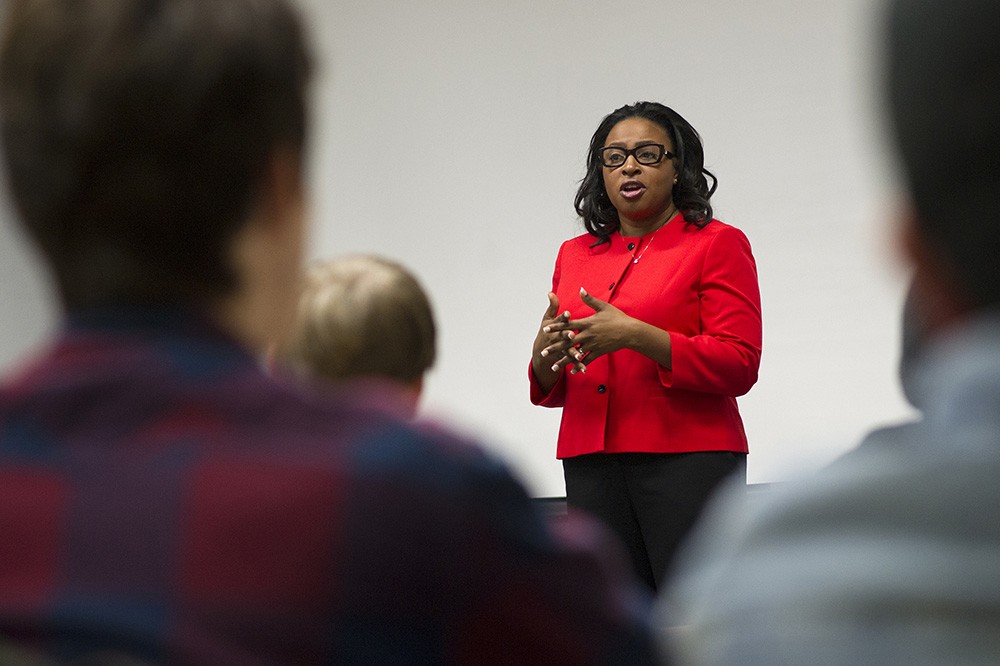 Rochester Mayor Lovely Warren answers questions from students in a public speaking class in the College of Liberal Arts Feb. 27. She said the rise of popularity of social media does not replace face-to-face conversations, which the students will need for job interviews. Although she admits she still gets nervous speaking in public, it helps to be prepared and know your audience, she said. -