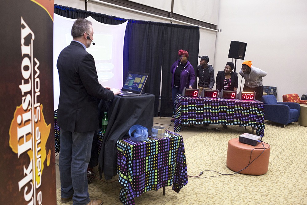 From left, Loryn Johnson, first-year biotechnology major from Columbus OH; Jayshaud Potter, second-year biomedical science major from Battle Creek, MI; Shantel Forrest, fourth-year marketing major from Rochester, N.Y.; and Chib Onwunaka, a graduate student in sustainable systems from Newark, N.J., competed in the Black History Game Show on Feb. 28 in Fireside Lounge. -