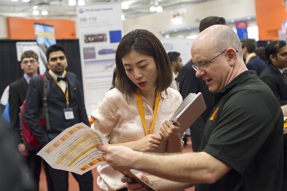 Xiao Cui, left, a first-year graduate student in visual communication design from China, talks with Steven Rubenstein, a chemist from Eastman Kodak Co., at RITâs Spring Career Fair March 1. More than 245 employers from across the U.S. interviewed more than 4,000 students seeking a co-op or full time employment at the event. -