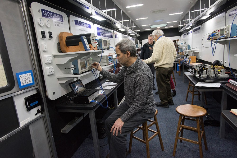 Carl Grossman, marketing director for Teach Spin, demonstrates equipment in the Food Truck for the Physics Mind. The truck is a 44-foot trailer containing 15 upper-level instruments for a hands-on experience in physics. The mobile unit was on campus last week for physicists to explore and test the apparatus. -