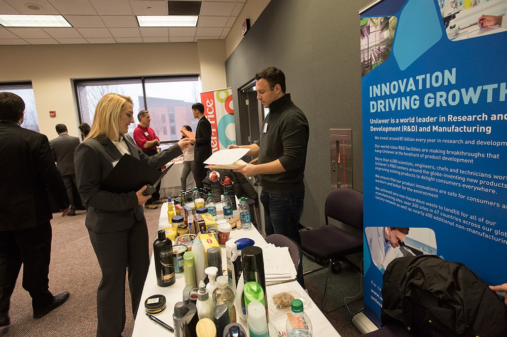 Sarah Thayer, a second-year packaging science student from Syracuse, N.Y., learns about opportunities at Unilever from their packaging engineer Rob Cupples. Representatives from more than 25 companies were available to meet with students at the annual Packaging Science Career Fair on Feb. 1 in Louise Slaughter Hall. -