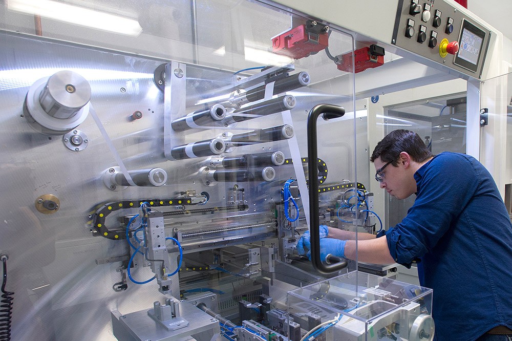 Martin Dann, a first-year graduate student in material science from Parish, N.Y., works with battery prototyping equipment in RIT's Battery Prototyping Center. The state-of-the-art center opened two years ago to conduct research and works with companies on prototyping the next generation of rechargeable batteries. -