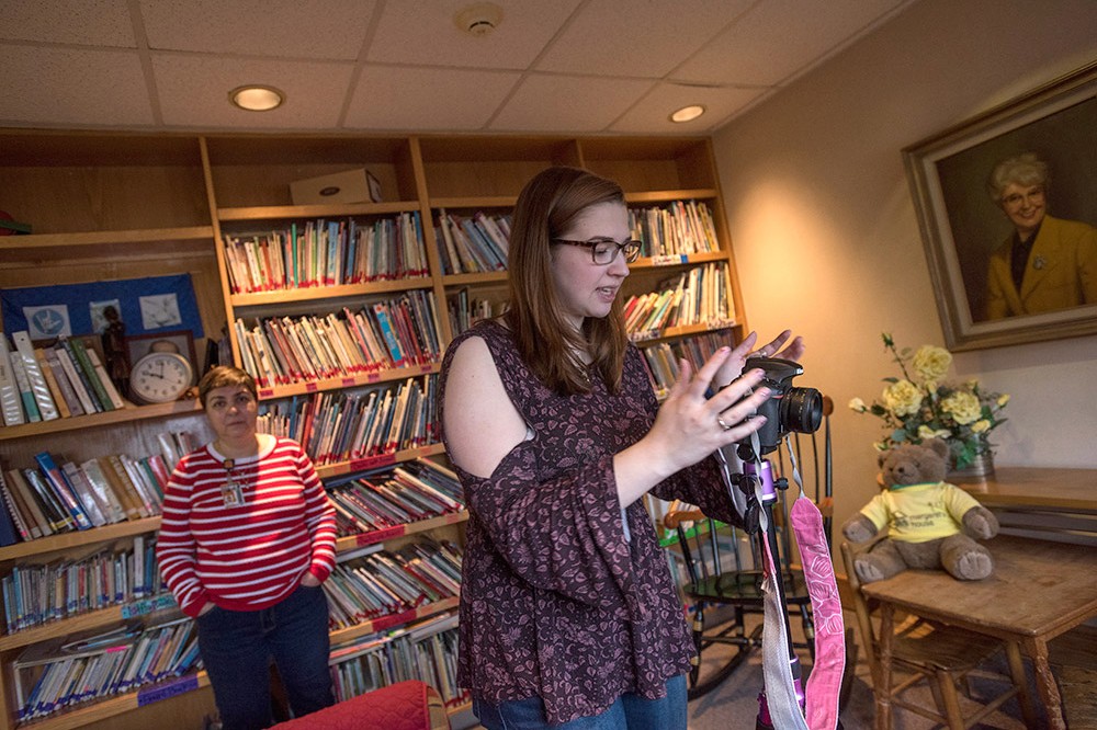 Kate McIndoe, a second-year fine arts photography major from Walworth, N.Y., prepares to video Ana Ambrosio, an associate teacher at RIT's Margaret's House. Ambrosio is one of four current Margaret House employees who was there 20 years ago when the childcare center's doors opened. McIndoe expects to post a video about their anniversary in February. -