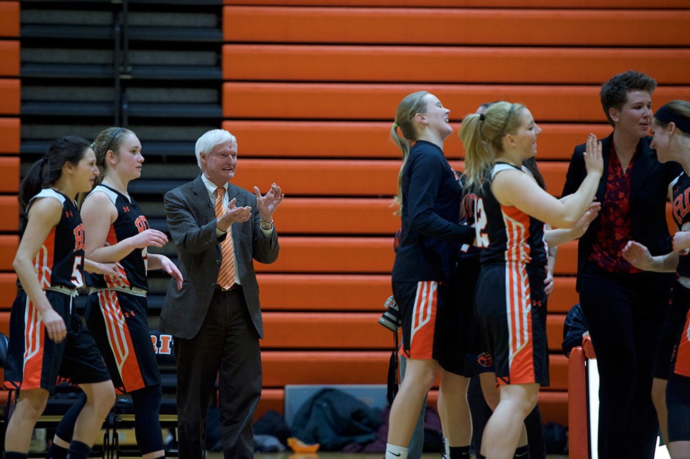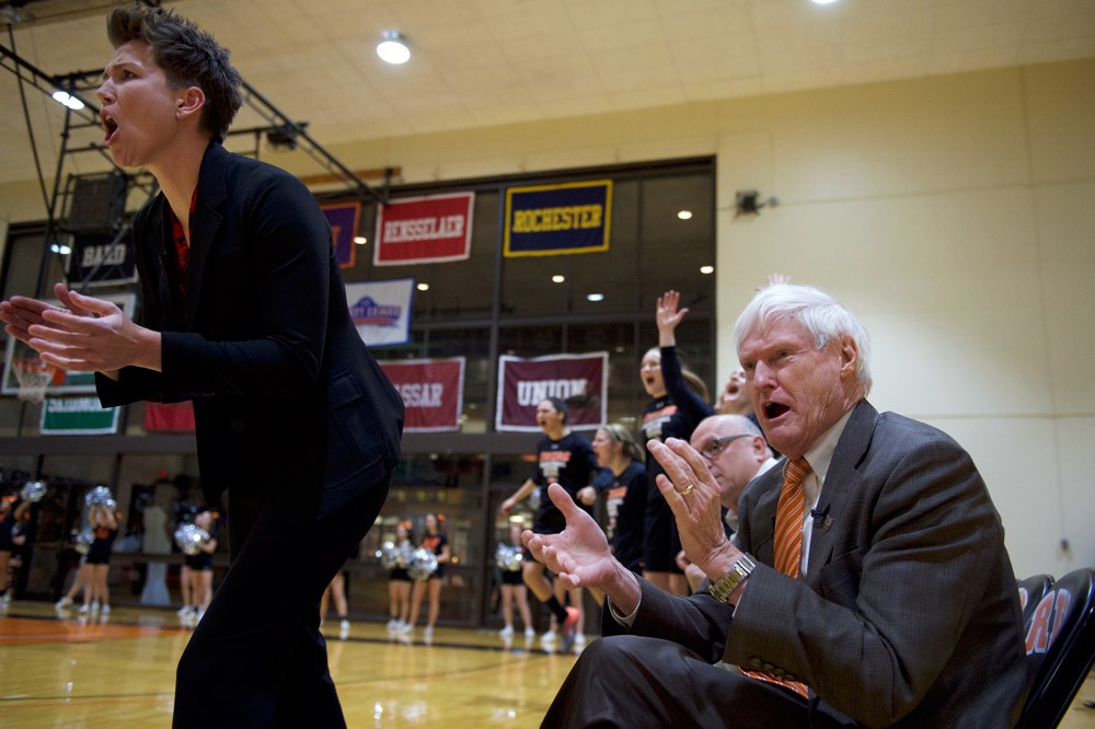 President Bill Destler was guest coach and sat alongside head coach Amy Reed, left, Feb. 3 at the RIT womenâs basketball game against Clarkson University. âI will do my best to support the team,â Destler said, âbut Iâll also know when to stay out of the way and let the coaching staff and players do what they do best. Go Tigers!â The RIT team defeated Clarkson 78-66. -
