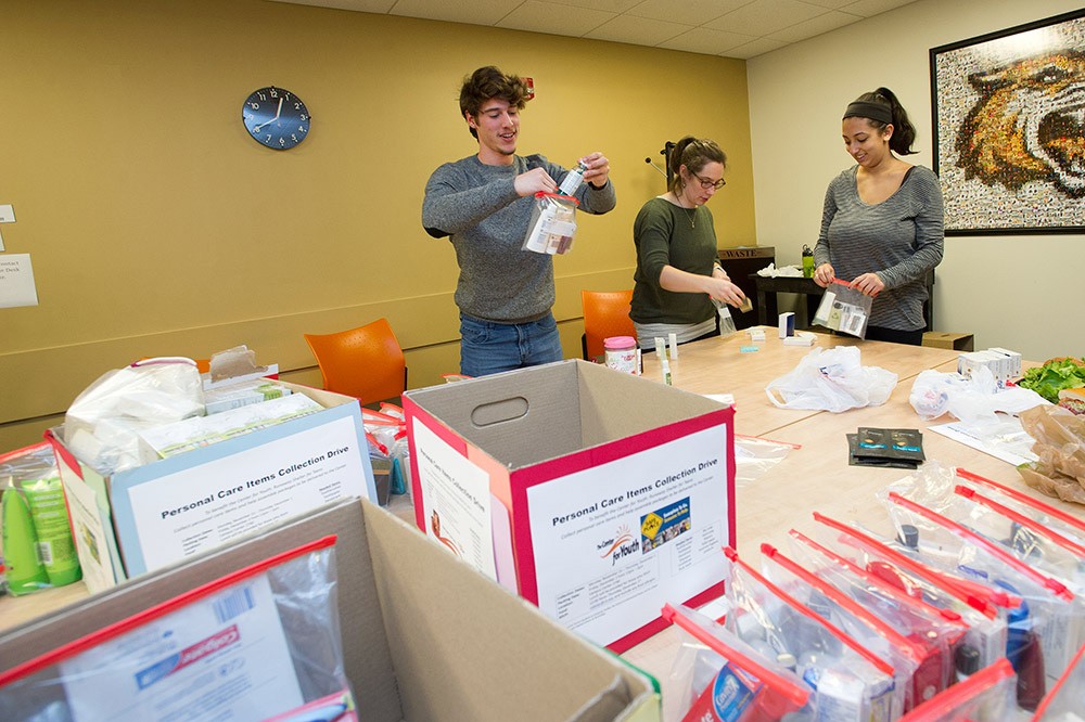 From left, Daniel Perez-Gil, a second-year honors student in management information systems and finance from Mexico City; Susan Lindsay, senior staff specialist in University Studies; and Jessica Visco, a first-year honors student in media arts and technology from Buffalo, N.Y., packed boxes of personal care items to deliver to The Center for Youth.