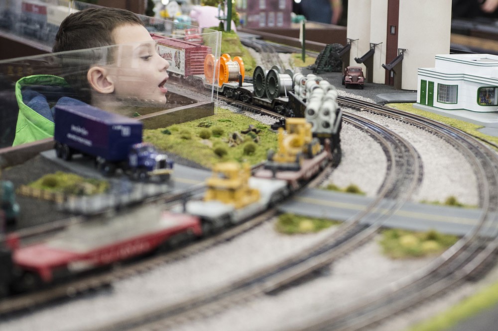 Six-year-old James Carpenter watches a model train roll down the track at the 11th annual RIT Tiger Tracks Train Show and Sale, hosted by the RIT Model Railroad Club. The event, held Dec. 10-11 in the Gordon Field House, included vendors selling new and vintage trains, accessories and layouts, door prizes and more. -