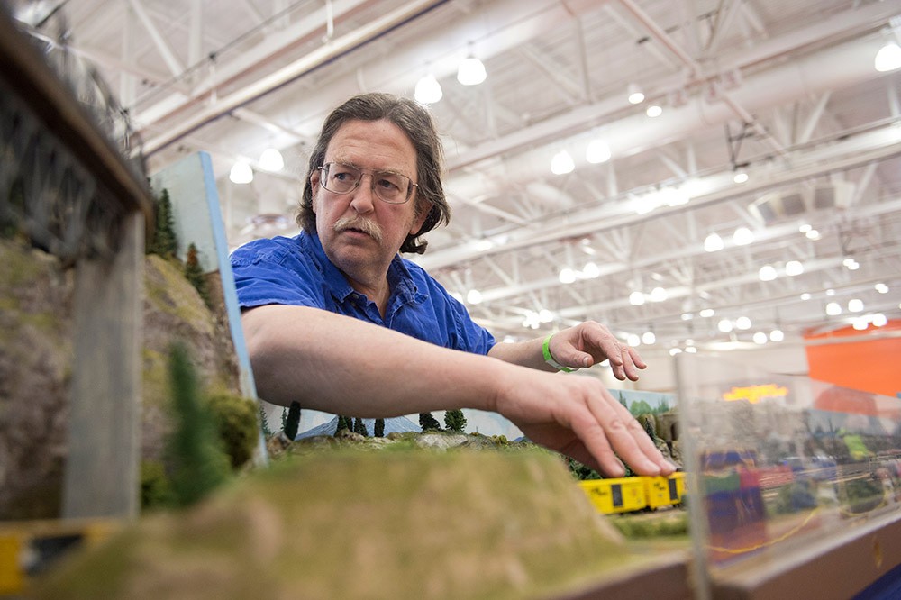 Larry Hayes, a vendor at the RIT Tiger Tracks Train Show, sets up his model train. Hayes has 50 years experience working with trains and claims âweâre all kids at heartâ. The Dec. 10-11 event included vendors selling new and vintage trains, accessories and layouts, door prizes and more. -