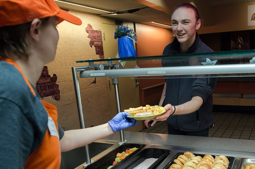 Second-year game design student Noah Ratcliff is served breakfast food at the Late Night Breakfast event at Gracieâs on Dec. 9. In addition to the special menu, students were treated to music and movies. -