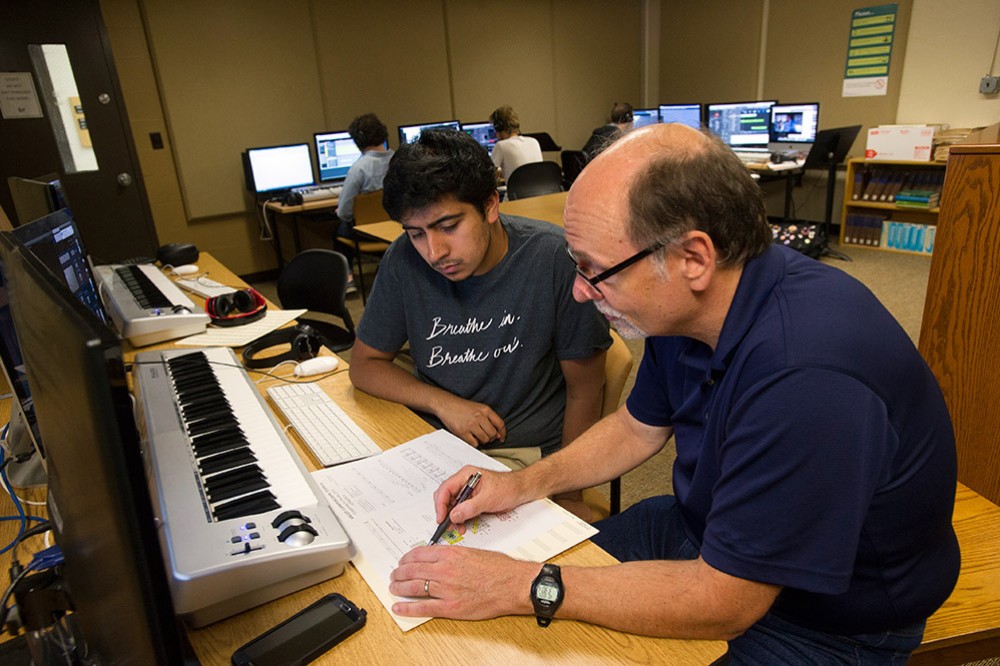 Shabab Siddiq, left, a fourth-year computer engineering student from San Jose, Calif., works in the music lab with Tom Davis, who teaches a music composition course at RIT. -