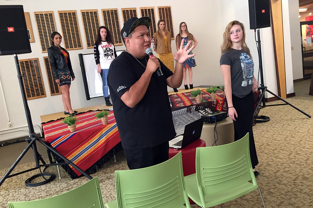 Native American designer Jared Yazzie, owner of OXDX Clothing, spoke about his culture and his symbolic clothing designs in Fireside Lounge on Nov. 15. Several women modeled his dresses, pants and tops. The event was part of Native American Heritage Month.