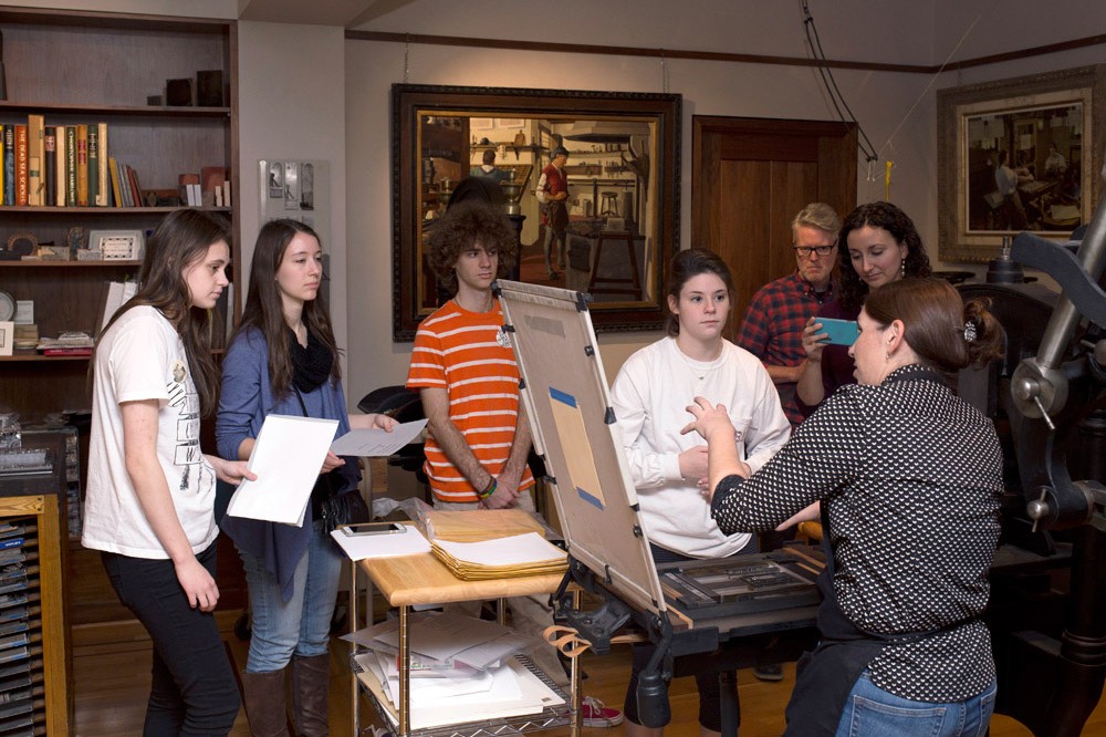 Amelia Hugill-Fontanel, associate curator at the Cary Graphic Arts Collection in The Wallace Center, demonstrated an Albion iron hand press on Nov. 18. Albion-style handpresses were first developed around 1820 in England by Richard Whittaker Cope. Their design proliferated, making them relatively inexpensive and popular in common small-job print shops. This Albion press housed in the Cary Collection belonged to the celebrated American artist John DePol (1913-2004) and was owned previously by prolific type designer Frederic Goudy (1865-1947). -