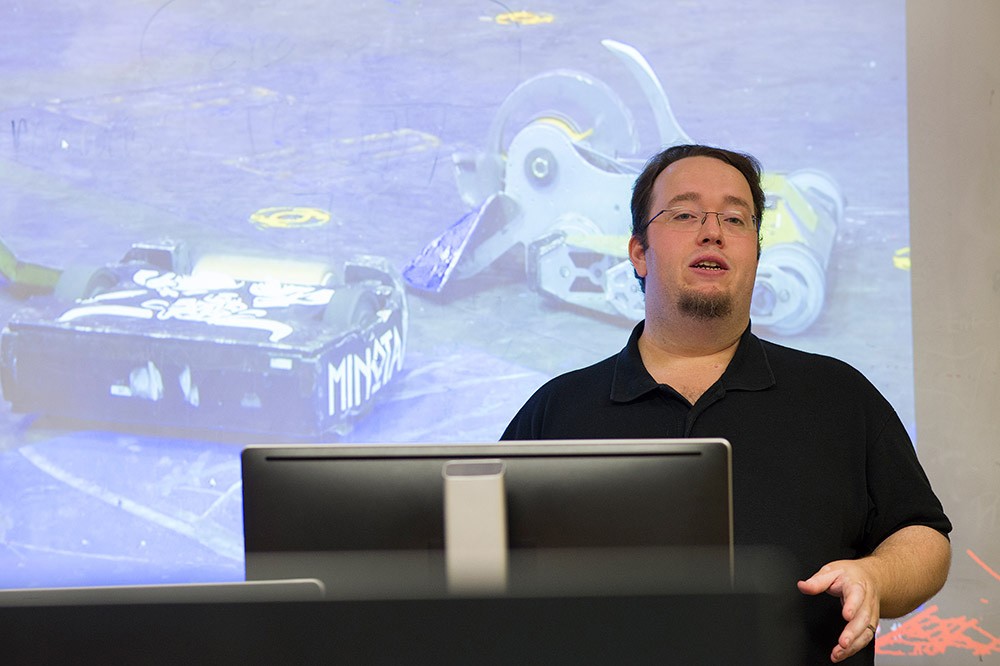 Mechanical engineering technology alumnus Mike Jeffries â11 spoke to undergraduates in Fundamentals of Engineering classes on Nov. 22 about how he took his fascination with building robots and built a career in developing advanced aerospace technology systems. Jeffriesâ competitive robot, Bombshell, and his Chaos Corp. team are the 2016 Battle Bots national runners-up. When he is not building competitive Battle Bots, Jeffries is a research technologist in the Aerospace, Transportation and Advanced Systems program at Georgia Tech Research Institute. -