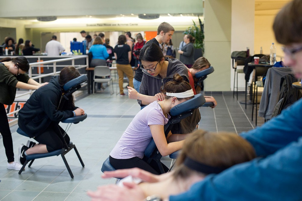 Xinyi Fan, a fourth-year industrial design student from China, gave massages at a Student Wellness event Nov. 30 in the Student Life Center. The stress-relief event included free chair massages, therapy dogs, a cooking demo and a yoga class. -