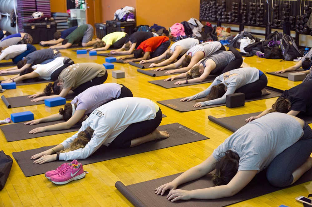 Student wellness ambassadors hosted an event in the Student Life Center that included a yoga class, free chair massages, therapy dogs and a cooking demo. -