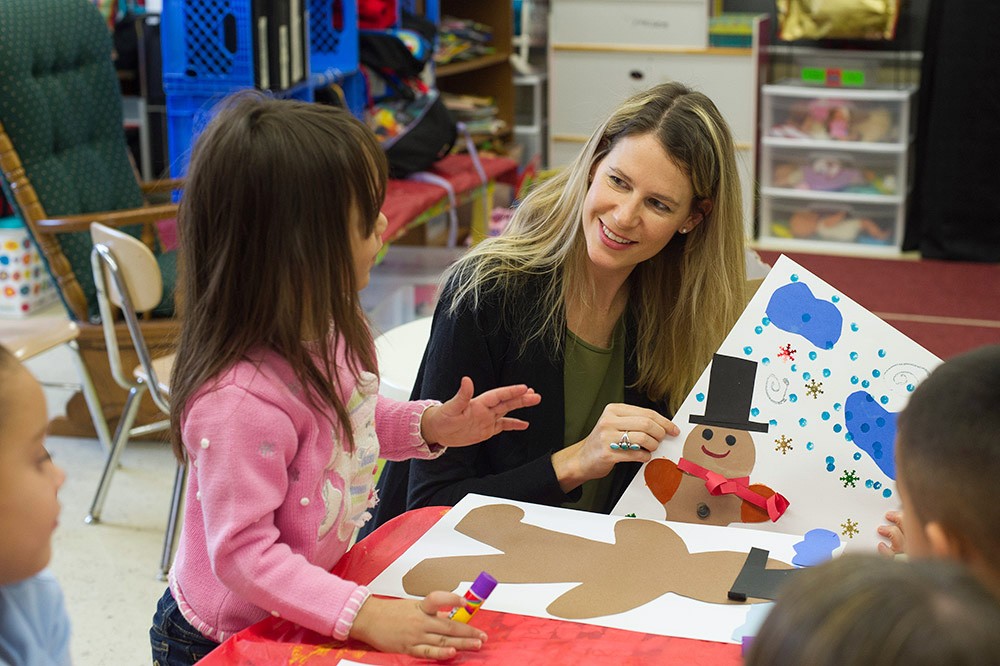Misti Roe, a student in the Master of Science in Teaching program in the College of Imaging Arts and Sciencesâ School of Art, leads a group of children at Rochester City School Districtâs School No. 29 in a creative activity. Roe, from Madison, Wis., was among RIT students who taught an art lesson to students in a specialized program for children with multiple disabilities. The RIT program prepares students to meet the national, state and regional need for teachers of the visual arts in grades K-12. -