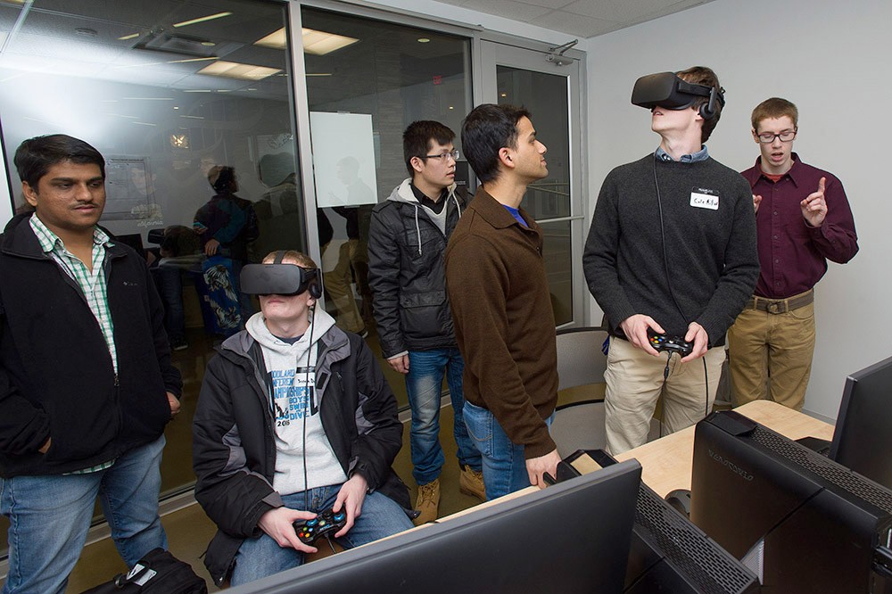 A group of students tests out the capabilities of the Oculus Rift headset during the AR/VR Symposium on Dec. 2. The symposium was hosted by Frameless Labs at RIT, a newly formed organization that brings together research, innovation and artistic creations surrounding augmented reality and virtual reality. The symposium featured expert speakers, lectures, workshops and demonstrations. Here, the students are viewing virtual reality scenes in an art gallery and planetarium in a program designed by RIT computer science students. -