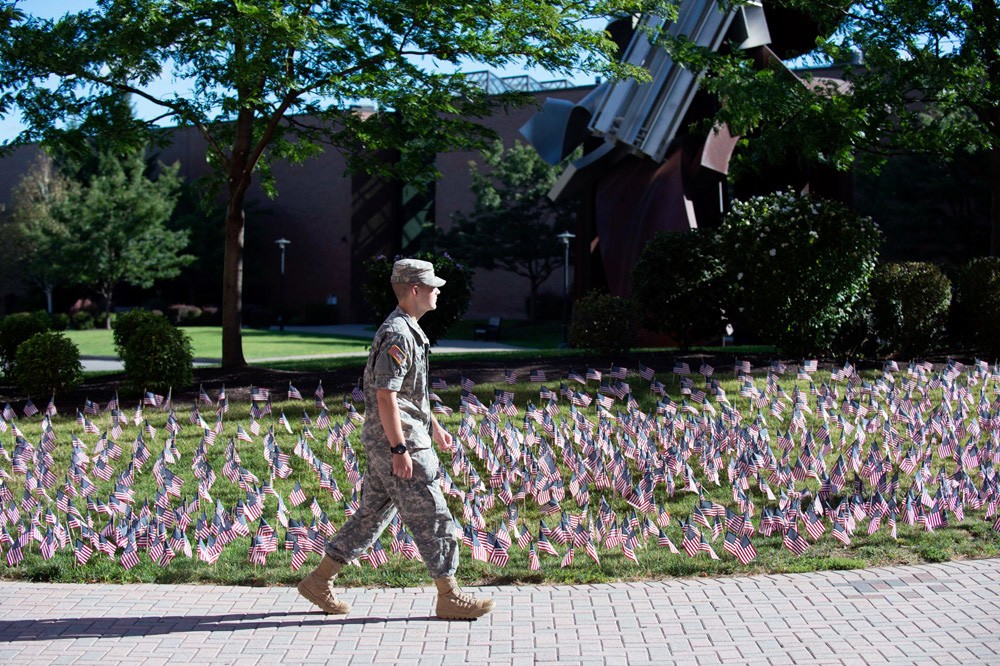 Collin Zelli, a third-year biology major and Army ROTC member, attended the 9/11 Remembrance Vigil on Sept. 11 on the grass knoll in front of the Sentinel statue, on the 15th anniversary of Sept. 11, 2001. An American flag was planted on the knoll for each of the 2,997 people who died in the attacks. -