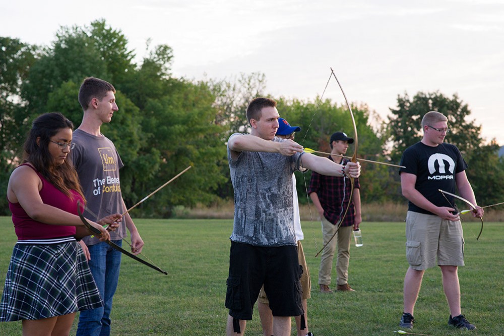 Left to right, RIT students Paola Vega, Bradley Loranger, Jeremy Hall, Cooata Pauling and Bruce Jones practice archery during the annual Longhouse Overnight and Day of Service at Ganondagan Historical Site, Sept. 9 and 10. Sponsored by RITâs Future Stewards Program, nearly 20 students and staff spent the evening doing activities, listening to stories of the Haudenosaunee who lived at Ganondagan, and preparing for volunteer projects around the site. -