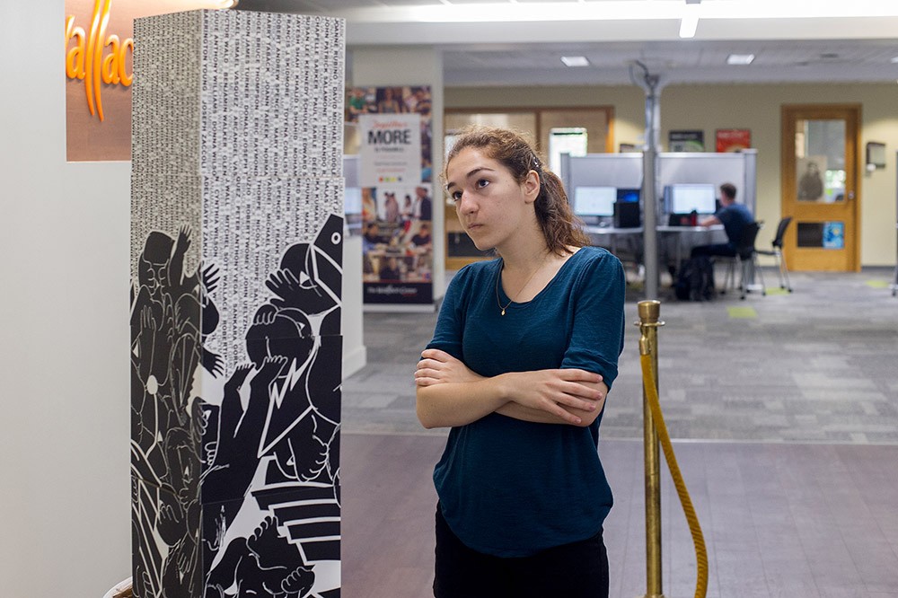 Julia Morris, a fourth-year illustration major from Kensington, MD, reads names on an art book installation. Out of the Sky: Remembering 9/11 by artist Werner Pfeiffer is a 5-foot tall reconstruction of the Twin Towers in paper that is on display on the first floor of The Wallace Center for the 15th anniversary of 9/11. The construction, on view until Sept. 23, combines woodblock printed images with names of the victims printed on the upper portions. -