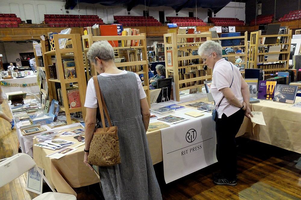 Customers peruse a selection of books published by RIT Press at the 44th Annual Rochester Antiquarian Book Fair held on Sept. 10. RIT Press, the Instituteâs scholarly book publishing enterprise, is co-sponsor for the Book Fair, the longest running regional book fair in the nation. -