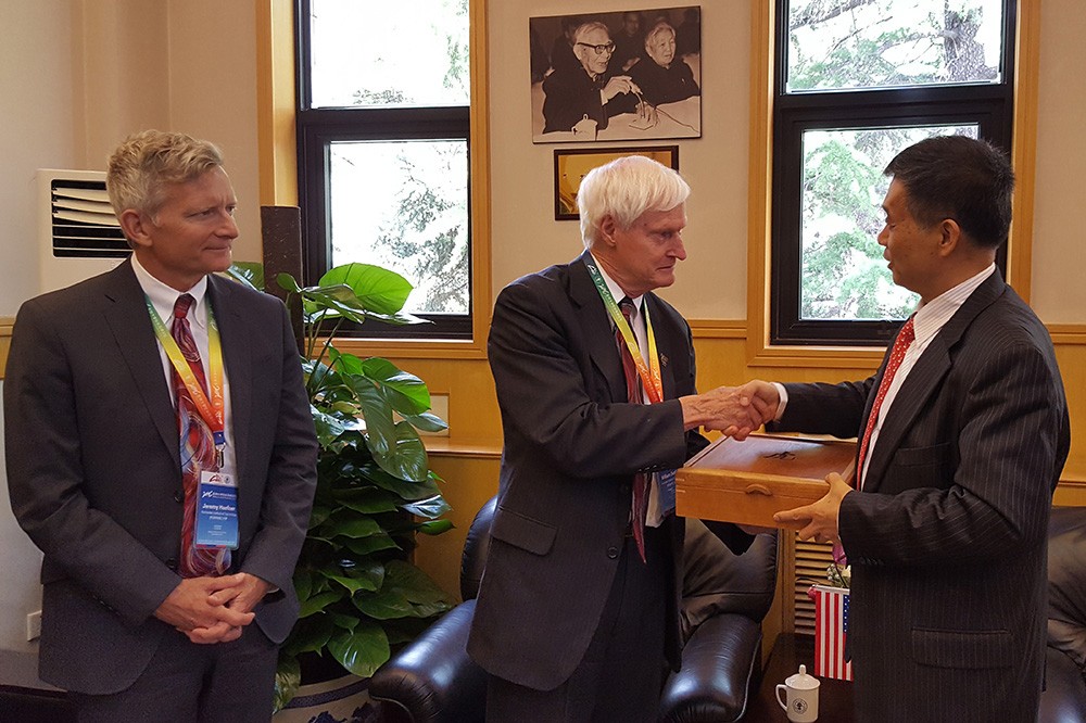 Provost Jeremy Haefner, left, and President Bill Destler traveled to Beijing, China, to celebrate the 120th anniversary of RITâs international partner, Beijing Jiaotong University (BJTU). Here they meet with Professor Bin Ning. RIT was honored to be at the 2016 Global University Presidents Summit held on the BJTU campus, sharing student success in interdisciplinary entrepreneurship and technological innovation with more than 100 participants from 37 universities representing 14 countries. This fall, 220 undergraduate students began class in the RIT-BJTU joint degree program in management information systems at the BJTU Weihai campus. RIT also welcomed a new cohort of 18 students in the joint graduate degree program in entrepreneurship and innovative ventures at the BJTU Beijing campus. -