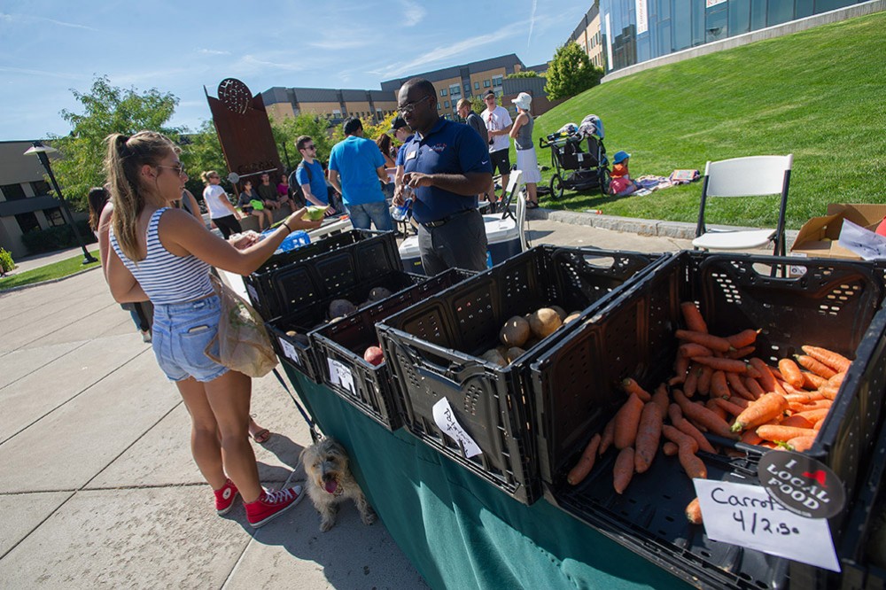 Jordan Guerrieri, a third-year advertising and public relations student from Rochester, stopped to buy some fresh corn while walking yorkipoo Maverick. The market in Global Village Plaza on Sept. 13 featured local produce, eggs, bread, honey products from the RIT Bee Keepers Club, chair massages and a live calf onsite. The next market dates are Sept. 27, Oct. 11 and Oct. 25. -