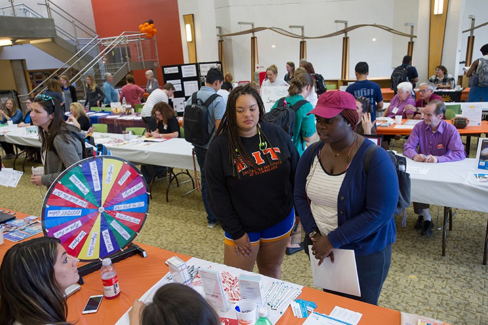 Paige Belfield, left, a second-year School of Individualized Study student from Boston, and Renee Hutton, a second-year university studies student from New York City, talked to representatives from various organizations in the Rochester area about volunteer opportunities during the Community Service Fair on Sept. 15. Nearly 30 agencies participated in the fair. -