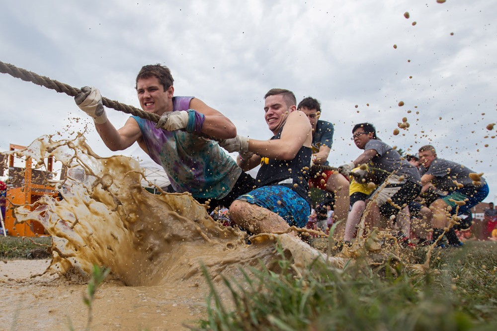 RIT students Greg Schmidt, on left, and Noah Blakenship participated in Mud Tug on Sept. 17. In the annual event hosted by Zeta Tau Alpha sorority and Phi Kappa Psi fraternity, teams of 10 compete in a tug of war tournament over pits of mud behind Grace Watson Hall. Money raised goes to Hillside Family of Agencies and the MLD Foundation. -