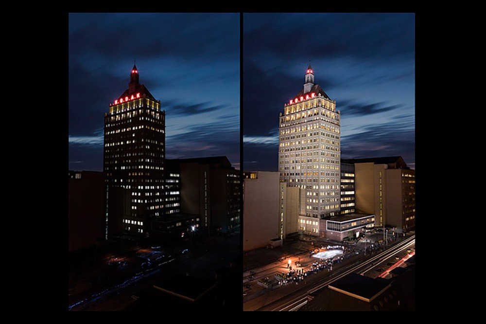 The 32nd RIT Big Shot illuminated the iconic Kodak Tower on Sept. 18. Nearly 3,000 volunteers provided the primary light source for a 60-second exposure at f14, ISO 50. -