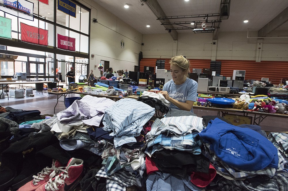 Lucia Kuvacic, a fourth-year international business student from Split, Croatia, sorts clothing during the set-up for the Goodbye, Goodbuy! sale. The sale, which runs through Saturday, offers incoming students the opportunity to buy used furniture, clothing, fans, lamps, televisions, kitchenware and more at bargain prices. The sale, in its second year, is a student-led sustainability initiative to help reduce items normally thrown out while offering needed items to incoming students. More than 70,000 pounds of items were collected in the spring. -