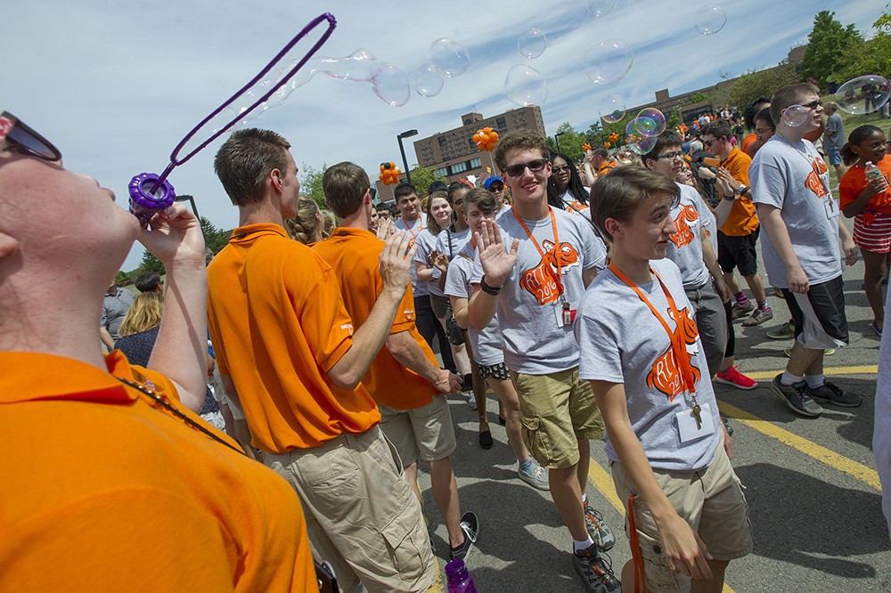 RIT students march in the Tiger Walk to the Convocation for New Students and Families in the Gordon Field House Aug. 17. About 2,660 first-year students have enrolled this year. -