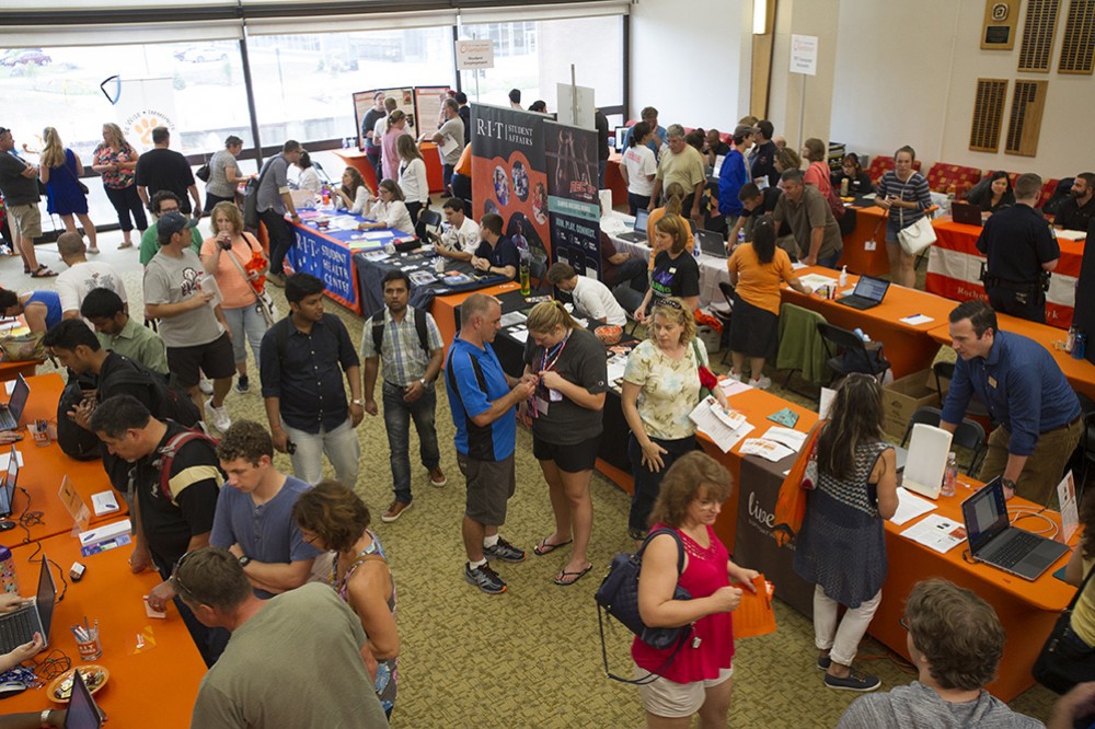 The Resource Fair, held August 16 in the Student Alumni Union, is a comprehensive event that allows new students and their families to get their questions answered, meet with staff members, take care of business, and get information regarding the resources and services available at RIT and in the community. -