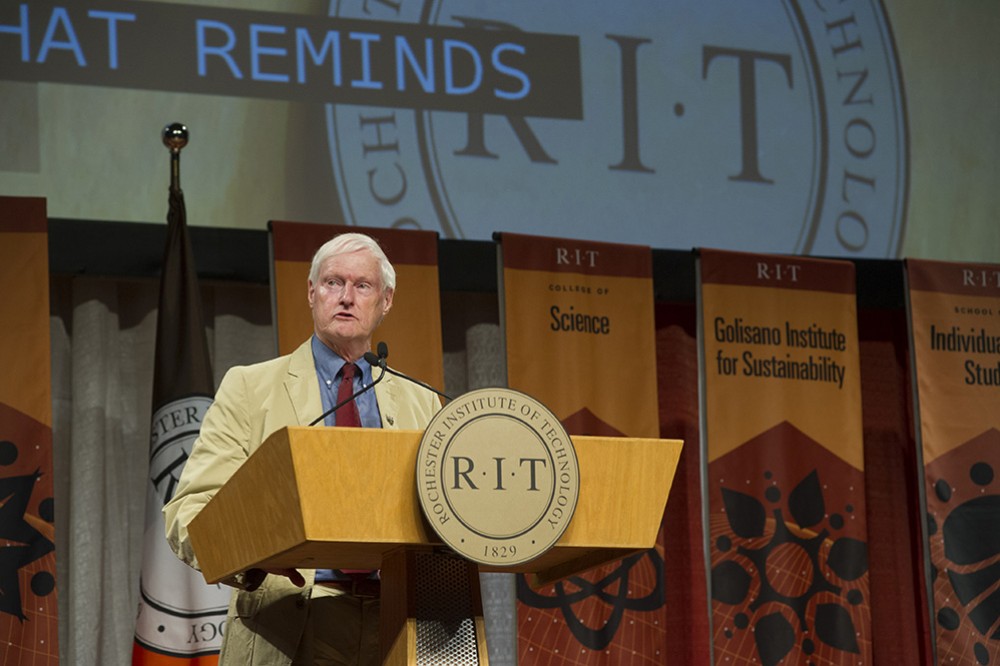 RIT President Bill Destler addresses the RIT community at the beginning of the 2016-17 academic year. It was his 10th and final welcoming address, as he plans to retire next summer. Destler said he will not coast to his retirement, and thanked RIT's faculty and staff, and his spouse, Rebecca Johnson, for the dedication and support. -