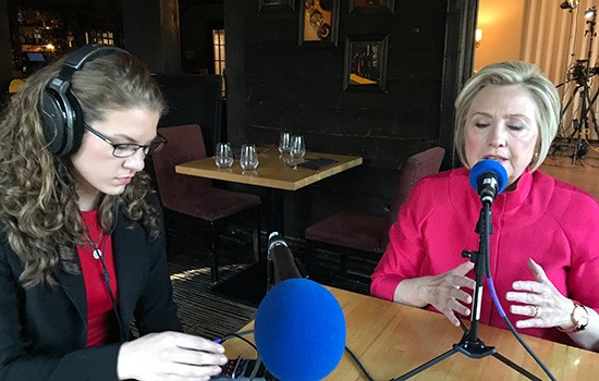 Carol Alderman '14, left, records a podcast in November 2017 with Hillary Rodham Clinton for Cape Up, hosted by The Washington Post Jonathan Capehart.