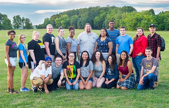 New students in RIT’s Future Stewards Program joined program staff and current members at the start of fall semester for the annual Longhouse Overnight and Day of Service event held at Ganondagan State Historic Site. Front row, left to right, are: Avinash Sonilal; Jeremy Hall; Jaelyn Sanchez; Nicole Scott, program co-director; Anna-Lucia Jacobson; Megan Wise; Paola Vega; and Bradley Loranger. Back row, left to right, are: Cianna Hall; Jenna VanStrander; Tiffany Cable; Bruce Jones; Nicolette Barcer; Brianna Hall; Jeffrey Burnette, program co-director; Elizabeth Lawrence; Jean Patrick Kayembe; Evan Rosenberg; Alicia Lazore ’15, guide at Ganondagan; and Cooata Pauling.