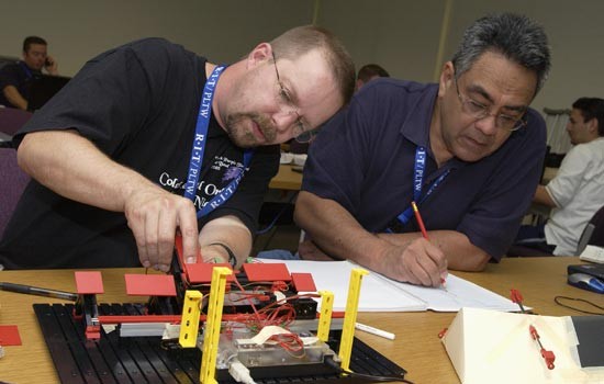 Phil Mason, left, and Richard Sanchez build marble sorters during their Project Lead the Way classes. The program received a $1.1 million grant that paid for up to 290 middle and high school teachers to receive engineering-focused curriculum training this summer.